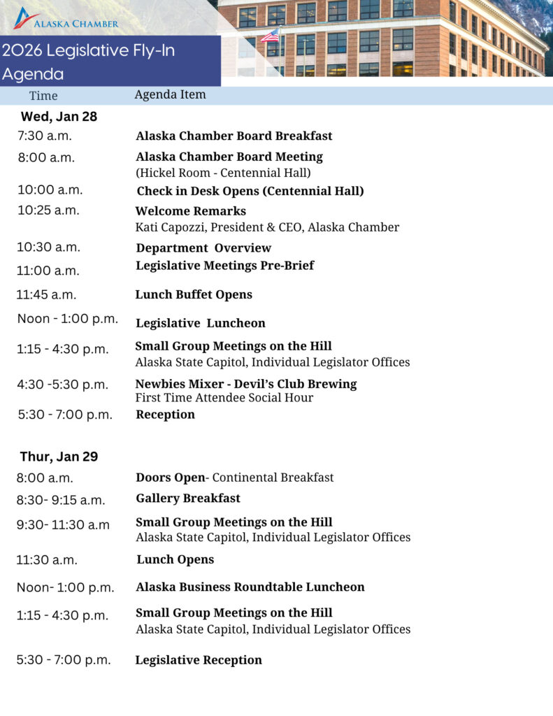 The Alaska Chamber's Legislative Fly-In gives you the opportunity to meet with the Legislature on issues and projects affecting Alaska business. Interact with members of the Alaska State Legislature and the governor's administration and present the policy positions adopted by the chamber membership as well as issues that are personally affecting your business. Every member who attends makes a difference.